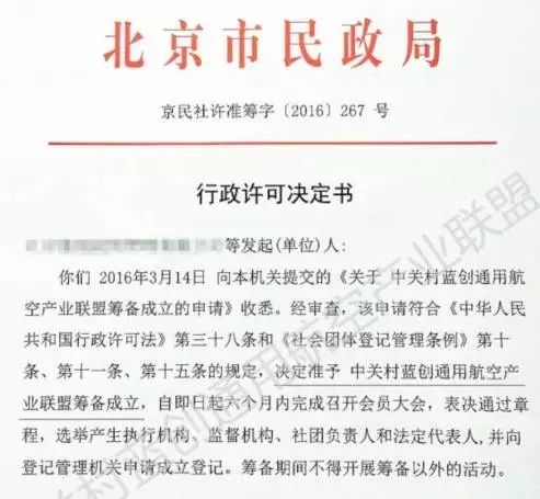 2016年1月16日,中关村蓝创通用航空产业联盟筹备会议在北京友谊宾馆召开。来自北京市政府、中关村管委会等各级政府领导,及来自全国通航产业各个领域的20余家单位代表出席了会议。3月16日,北京市民政局下发行政许可决定书,决定准予中关村蓝创通用航空产业联盟筹备成立。