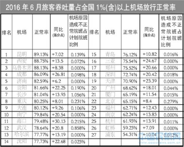 2016年6月国内客运航空公司平均航班正常率68.43%,同比提高8.61个百分点。