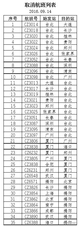 2、9月14日台湾地区进出港航班部分取消 。